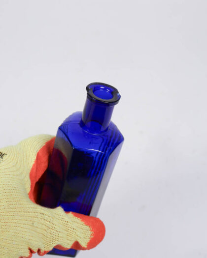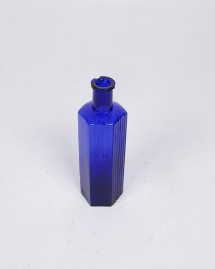 Antique cobalt blue glass poison bottle with embossed ribs. Excellent condition for its age. A unique and striking decorative piece.