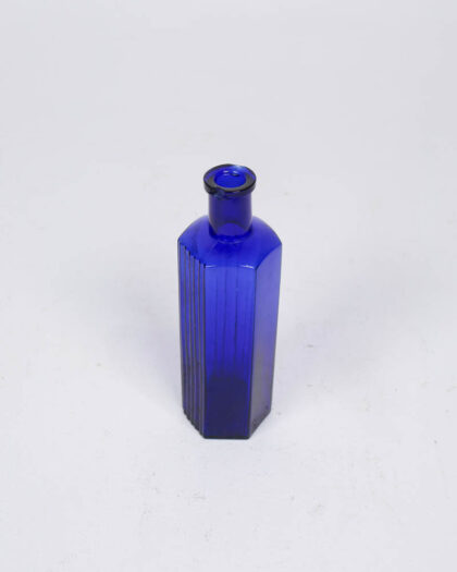 This is a lovely antique poison bottle, crafted from a striking cobalt blue glass. The bottle has an octagonal shape with vertical ribs embossed into the glass on each side, adding tactile and visual interest. The bottle has a short neck and a simple, slightly rounded lip.