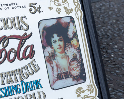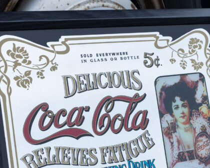Vintage Coca-Cola advertising mirror in a dark grey painted wooden frame. The mirror features an Art Nouveau-style design with floral motifs and an image of a woman holding a Coca-Cola glass. The text reads "Delicious Coca-Cola Relieves Fatigue The Most Refreshing Drink In The World. Sold everywhere in glass or bottle 5c". A beautiful piece of Coca-Cola memorabilia. The frame is in good condition commensurate with age.