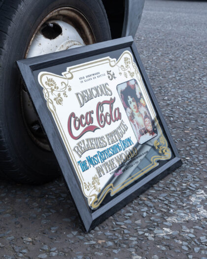Vintage Coca-Cola advertising mirror in a dark grey painted wooden frame. A beautiful piece of Coca-Cola memorabilia. Perfect for collectors.