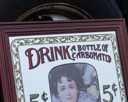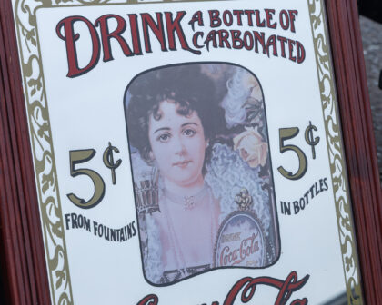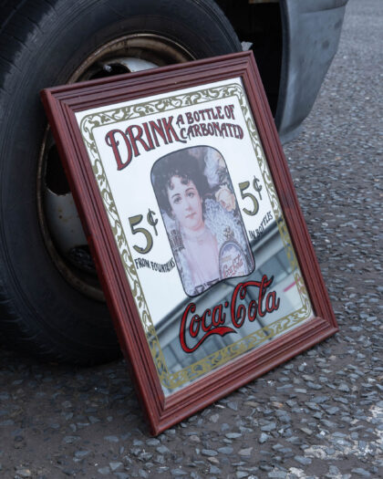Vintage Coca-Cola advertising mirror sign with ornate wooden frame. A great piece for collectors or vintage enthusiasts.