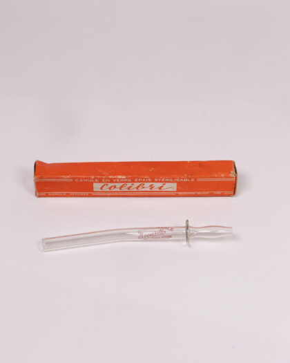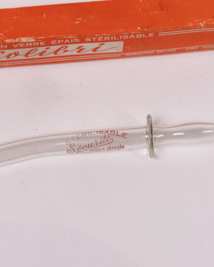 This is a vintage Colibri glass enema syringe complete with its original box. The syringe is made from thick, clear glass and features a sterilizable design. It has a bulbous end for comfortable insertion and a ring to prevent over-insertion. The syringe is marked with 'STERILISABLE Sécurité MARQUE DÉPOSÉE'. The box is orange and printed with 'CANULE EN VERRE ÉPAIS STÉRILISABLE' and the Colibri brand name. The box shows signs of age, with some wear and tear on the edges and corners. Overall, the syringe and box are in good vintage condition.