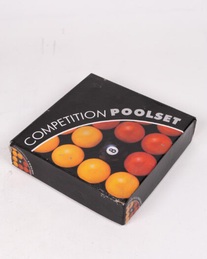 This competition pool ball set comes in its original packaging. The set includes a black '8' ball along with yellow and red balls. The box shows wear and tear commensurate with age and storage, with scuffs and marks visible, enhancing its vintage appeal. Overall, the pool ball set is in good, usable condition, a nostalgic addition to any game room or collection.
