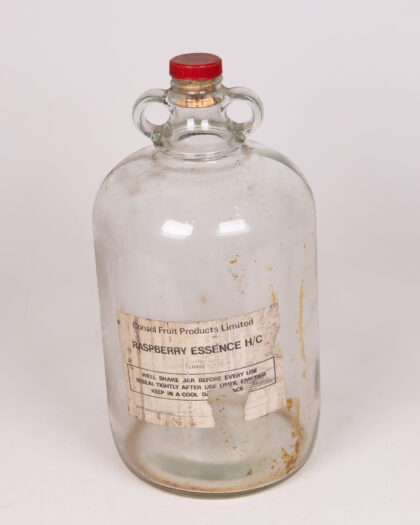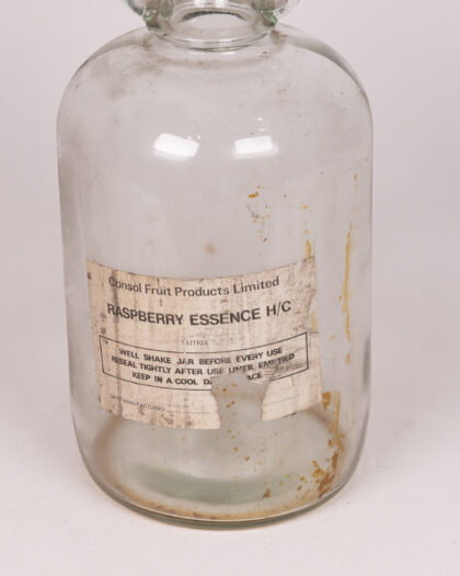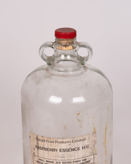 Vintage Consol Fruit Products Raspberry Essence H/C 1 Litre Bottle with a red screw top lid and looped handles. A unique display piece.