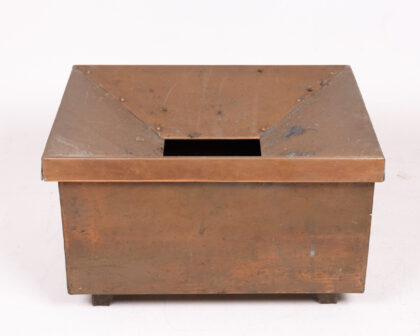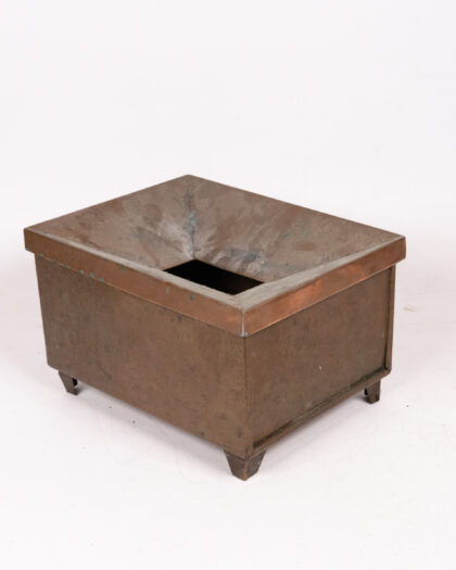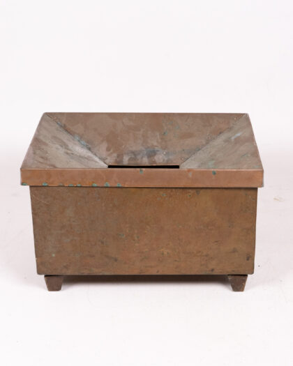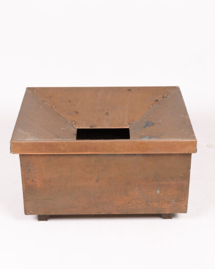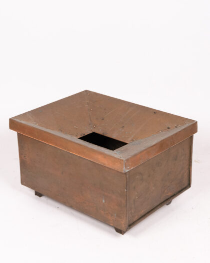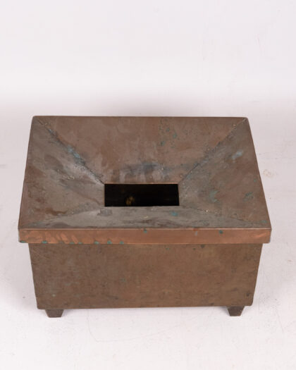 This is a copper box with a square opening at the top, mounted on four small feet. The copper has a weathered patina with verdigris showing through in places. There are a few marks and dents consistent with age and use. This would be a great storage box or could be repurposed in several ways. The aged patina adds to the character of this great vintage piece.