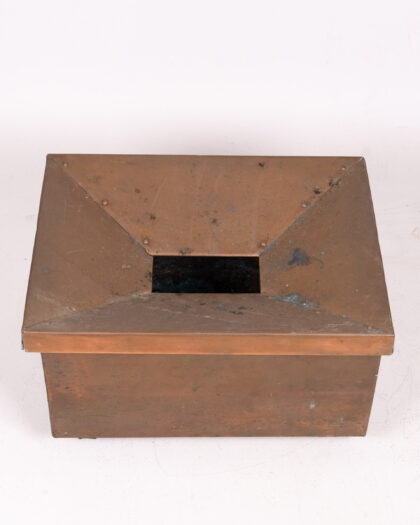 Vintage copper box with an aged patina and a square opening. A unique storage or decorative piece for industrial or vintage decor.
