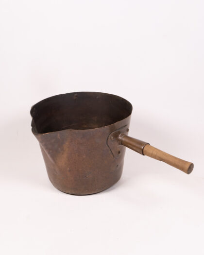 A well-used copper pan with a hand-turned wooden handle. It features a riveted metal section between the wood and the copper. This pan has an elegant, long handle and a curved pouring section on one side. Copper is worn in places, but that adds to its vintage feel. This item would look beautiful on display in a vintage-style kitchen or would be great for use. It is well made and durable.