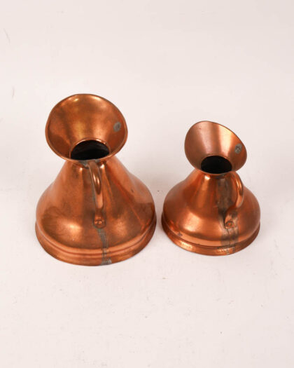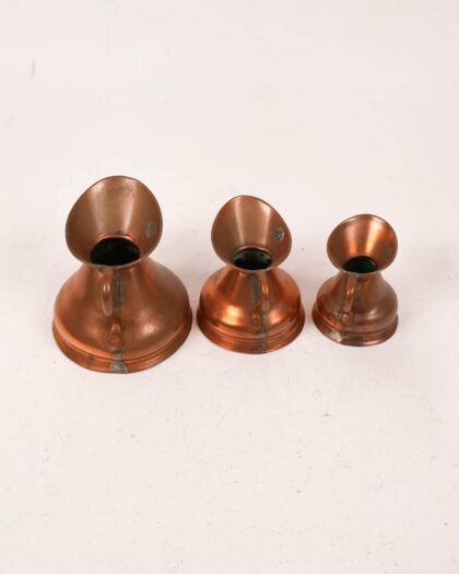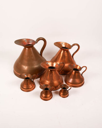 Set of seven vintage copper measuring jugs. Graduated sizes. Signs of age and wear throughout. Great decorative display pieces.