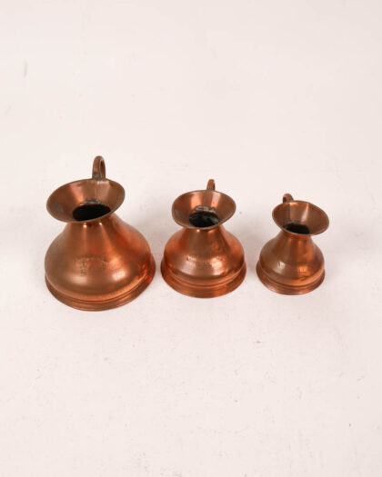 This is a set of seven antique copper measuring jugs, crafted from copper and displaying a pleasing graduated size range. The copper has a naturally aged patina that provides a warm tone, although some areas are more heavily tarnished. There are some dents and marks on all of the pieces.