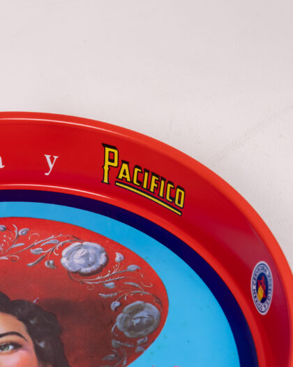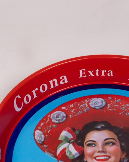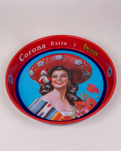 Vintage Corona Extra y Pacifico beer serving tray. This vibrant tray features a bold design with a traditional woman in Mexican attire. The tray has a striking red rim with blue and yellow accents. Perfect for adding a touch of vintage charm to any home bar or collection. Condition is good overall. There are some minor scratches and signs of wear, consistent with age. The colourful graphics are still vibrant, making it a great display piece.