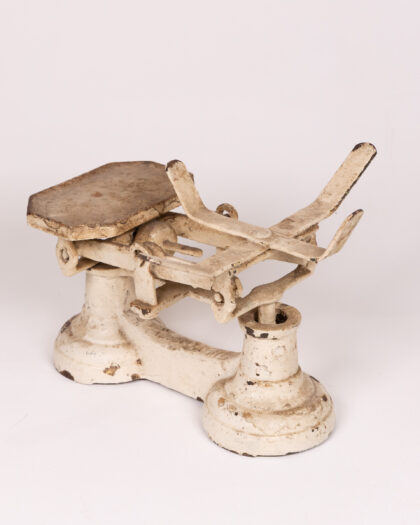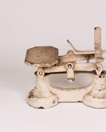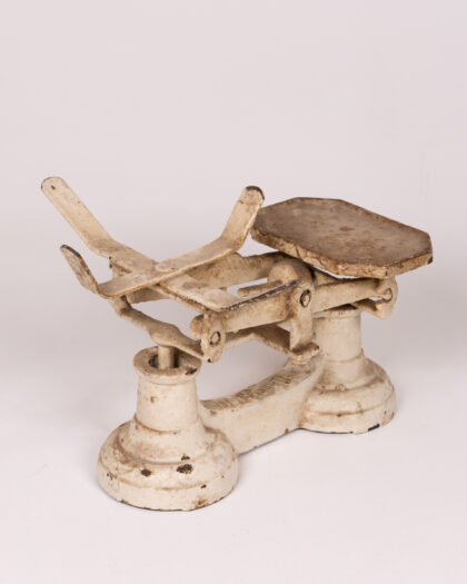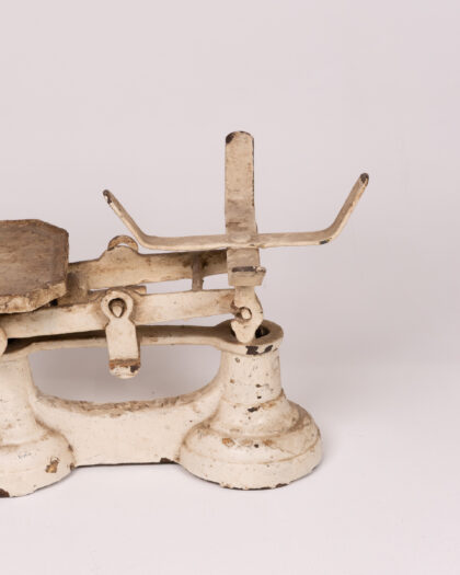 Vintage cream painted cast iron shop scale with a wooden platform. This weathered scale has a wonderful rustic charm, with its distressed paintwork and aged wooden platform. The scale has a metal arm with a hook. This item shows its age and use with areas of paint loss, rust, and marks to the wooden platform. This adds to its vintage charm and character.