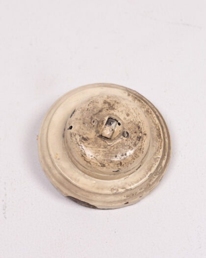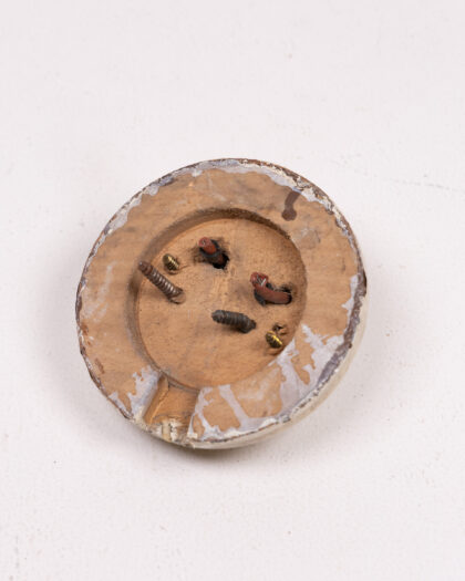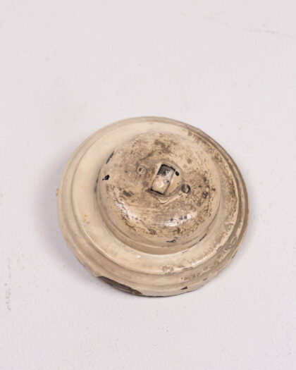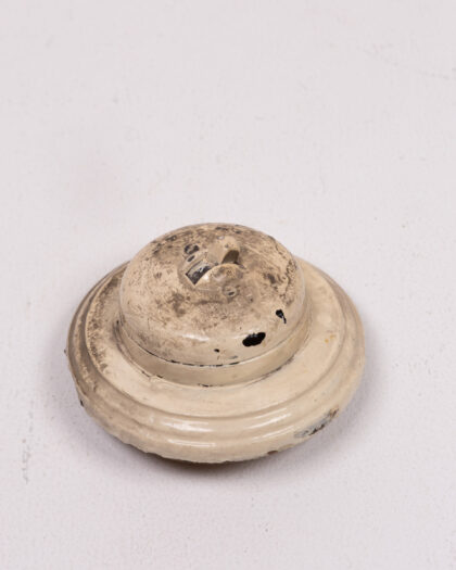 This is a vintage ceramic light switch cover, featuring a cream colour with an aged finish. The circular design has a raised centre. The cover displays signs of wear and patina that are consistent with its age, contributing to its vintage appeal. The back shows the mounting mechanism. Ideal for adding a touch of vintage charm to any room. Please see images for condition.