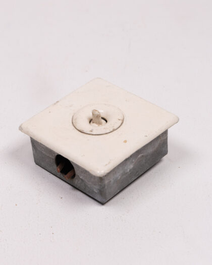Original vintage light switch with ceramic top and metal base. Salvaged condition with signs of wear. Perfect for vintage renovation.