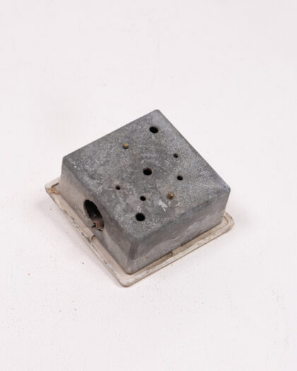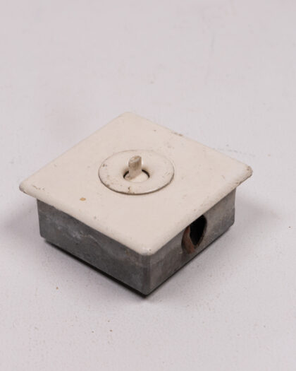 This is a vintage light switch with a cream-colored ceramic switch and a grey metal base. The switch shows signs of age and wear, including some discoloration and marks, which add to its vintage charm. It is a salvaged item and would be suitable for vintage-themed projects or decorative use. This item is a unique piece, ideal for adding character to a renovation project or as a decorative item for those interested in vintage electrical fittings.