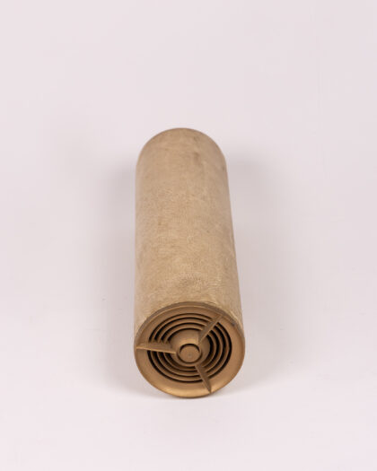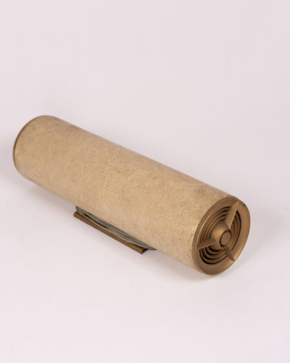 This vintage portable speaker features a cream-coloured fabric covering over a cylindrical body. The speaker grill is gold toned, adding a touch of elegance to the design. The speaker includes an attached electrical cable. It is ideal for adding vintage charm to a home office, living room, or any space where music is enjoyed. Note this is untested sold as prop..