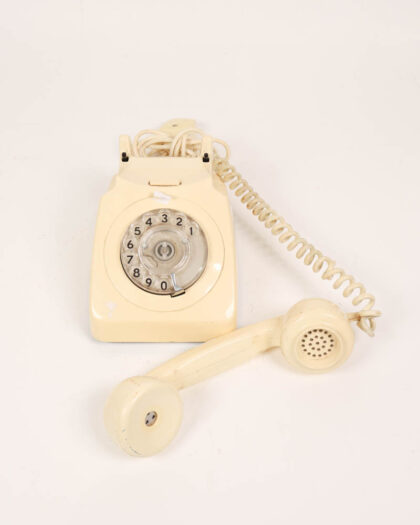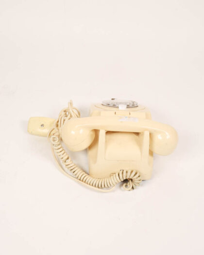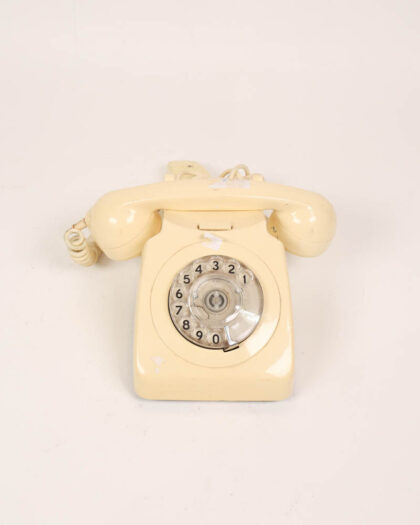 Vintage rotary dial telephone. Cream plastic body with rotary dial and handset. Some discolouration consistent with age.