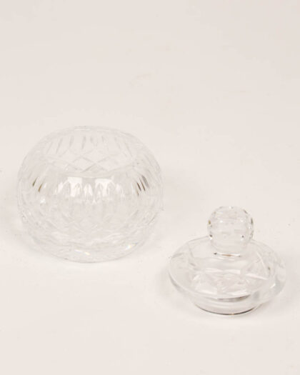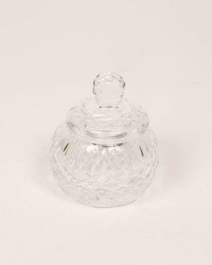 Vintage crystal bonbon jar with a faceted design and lid with a round handle. No chips or cracks. Perfect for display or storage.