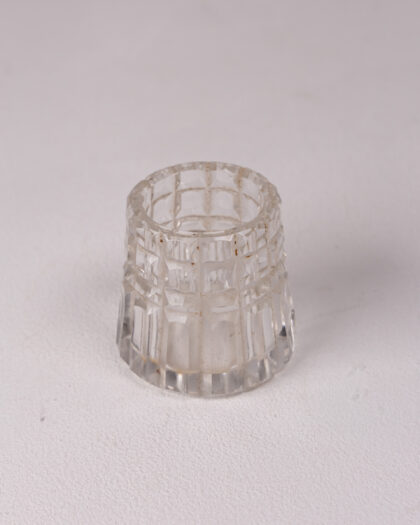 Discover this charming vintage crystal cut glass trinket pot, perfect for holding your most cherished small jewellery pieces or precious keepsakes. This petite holder features an elegant geometric design with a captivating pattern of raised squares and vertical lines that beautifully catches the light. While the clear glass retains its inherent sparkle, it shows some gentle signs of age and use, including light staining, which contributes to its authentic vintage character. It remains in good condition, ready to add a touch of classic elegance to any dresser, vanity, or shelf. Ideal for rings, earrings, cotton buds, or other small treasures.
