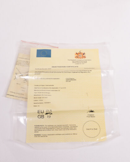 A vintage deactivated double barrel shotgun manufactured in Czechoslovakia. The shotgun is a Special Polol Elektra, 12 bore model, and features wooden stock and metal barrels.The shotgun has markings indicating it was made in Czechoslovakia. Comes with deactivation certificate. This item is perfect for collectors of militaria, weaponary or firearms. This vintage piece has signs of wear and tear appropriate for its age and use, with some patina on the metal parts and wear to the wooden stock.