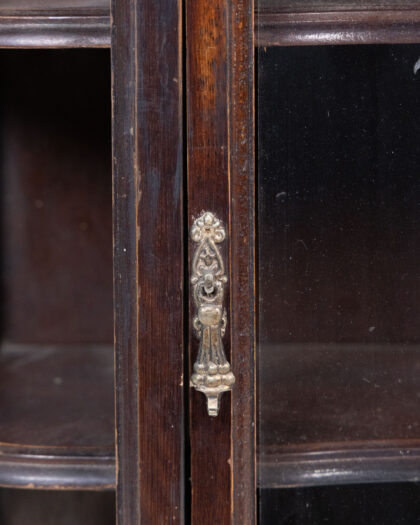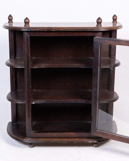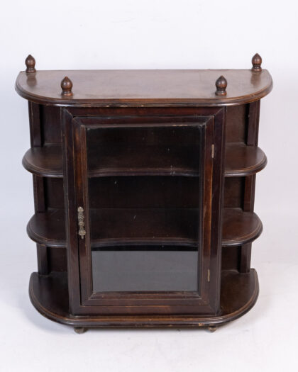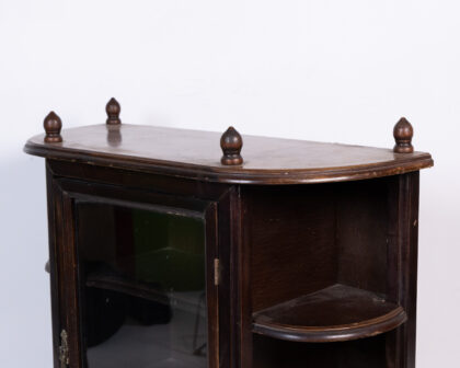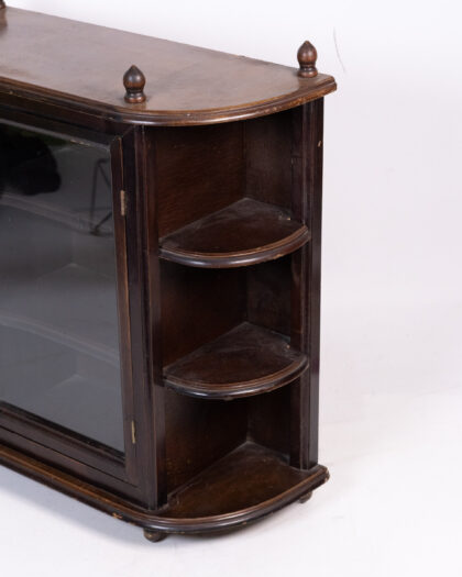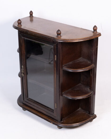 This is a vintage curio cabinet, ideal for displaying small collectibles and treasures. The cabinet is constructed of wood with a glass door. It has three shelves on each side and decorative finials on top. The door handle has an aged patina. This display cabinet would look good mounted on a wall in a living room or hallway.