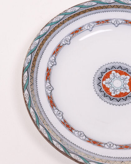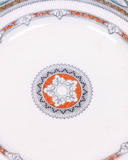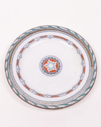 This is a vintage decorative plate featuring intricate concentric circle designs with various patterns. The plate has a white base colour with detailed orange, green, and black accents. The center features a stylized floral motif, surrounded by geometric and floral bands. The rim of the plate is finished with a green and white intertwined pattern. The back of the plate has some markings and a possible maker's mark. Overall, this plate shows some signs of age but remains a striking decorative piece.