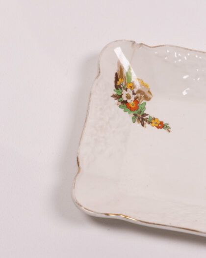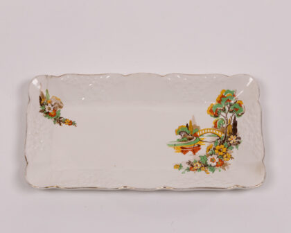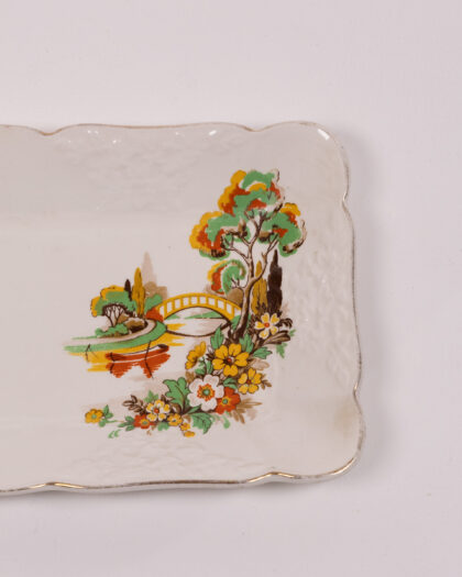 Vintage decorative ceramic tray with a lovely landscape design featuring trees, a bridge, and flowers with a gold trim on the scalloped edge.