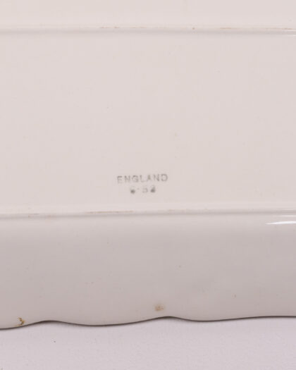 This is a charming decorative tray featuring a picturesque landscape design. The tray is primarily white with a textured surface. The landscape design includes trees, a bridge, and flowers in shades of green, orange, yellow, and brown. A gold trim accents the scalloped edge of the tray, adding a touch of elegance. The back of the tray is marked 'England'. It would make a lovely addition to a dining room or kitchen.