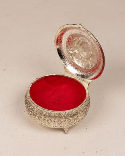 This exquisite vintage jewelry box features a stunning floral design embossed on a metal surface. The intricate detailing and elegant craftsmanship make it a perfect decorative piece for any collection. The box is in good condition, with some signs of wear typical of vintage items. It measures approximately 10cm in diameter, ideal for storing small trinkets or jewelry.