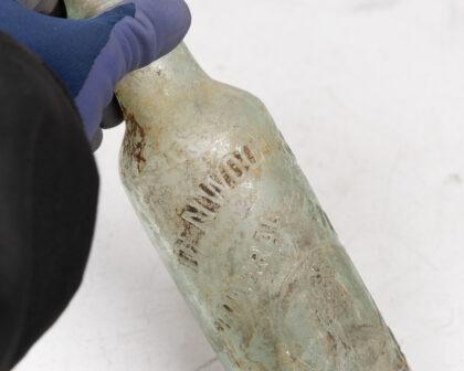 Antique Denwood & Sons Mineral Waters Carlisle bottle. The glass has a pale green hue and features embossed lettering and a central emblem. The bottle exhibits signs of age, including dirt and residue both inside and out, contributing to its vintage character. Would benefit from a clean. Perfect for collectors of antique bottles or breweriana. 21cm high