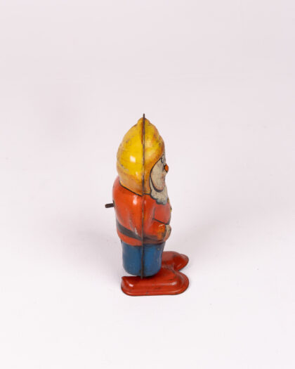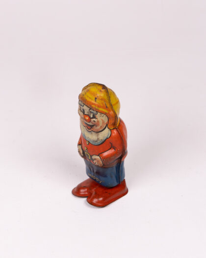 This vintage Disney 'Happy' dwarf wind-up toy, produced by Walt Disney, is made of metal and features detailed lithography. It is in good condition considering its age, with some visible wear and minor paint loss which adds to its antique charm. The mechanism still works. A great item for collectors of Disney memorabilia and vintage toys. Perfect for display.