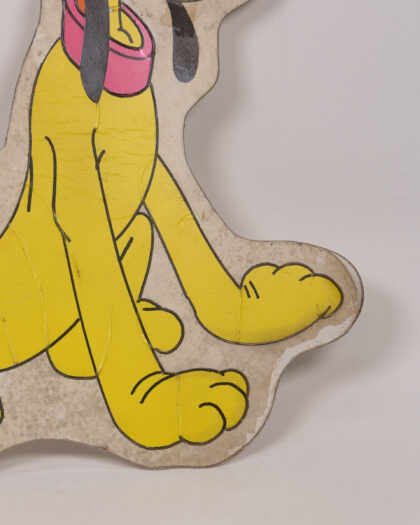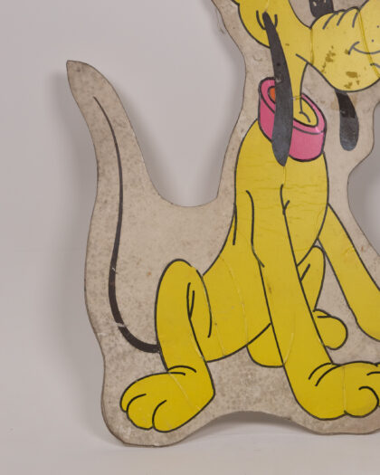 This is a vintage wall plaque featuring Pluto, the beloved Disney cartoon character. The plaque is made of wood, with a paper print of Pluto attached. The colour scheme is dominated by yellow, with pink collar and black details. This item would be perfect for a children's room or as a decorative piece for Disney collectors. It is in good vintage condition, showing some signs of wear and tear that add to its charm and character.