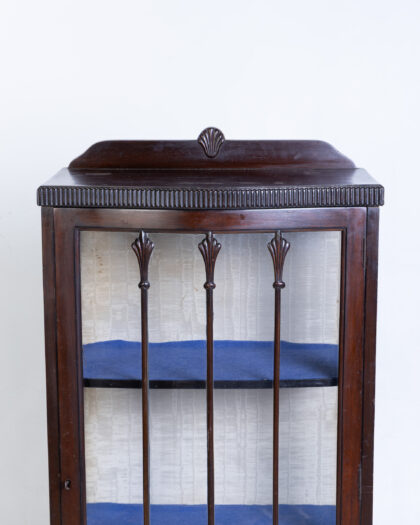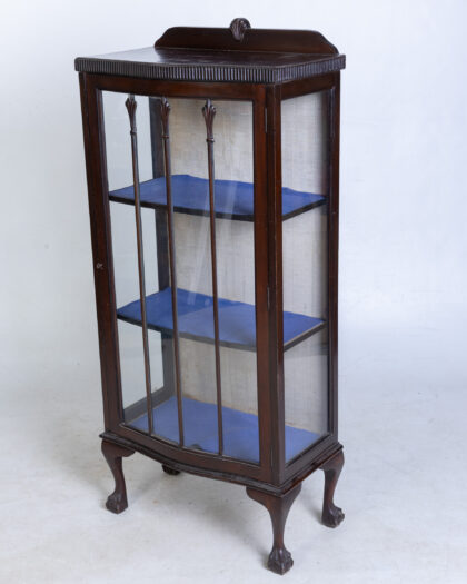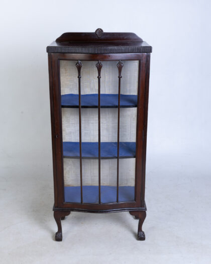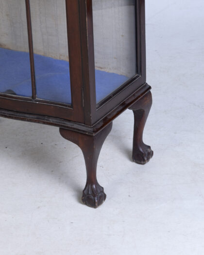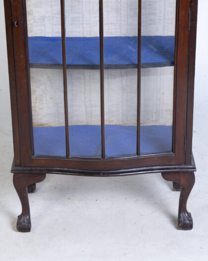 Vintage dark wood display cabinet with glass door, three blue-lined shelves, and decorative claw feet. Perfect for elegant display.