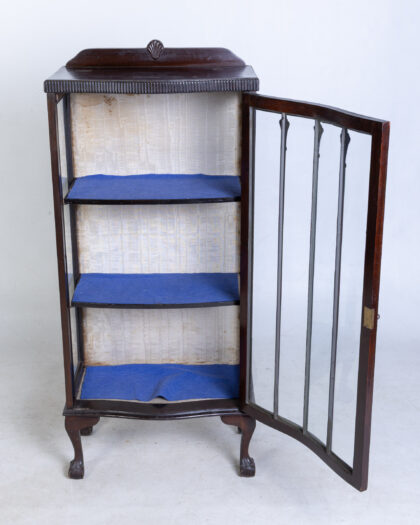 Discover this charming vintage display cabinet, meticulously crafted with a rich, dark wood frame and an elegant glass door. The cabinet features three interior shelves, beautifully lined with a vibrant blue fabric, complemented by a subtle cream patterned fabric backing, adding a touch of sophisticated color. Ornate, decorative cabriole legs with classic claw feet support the piece, enhancing its antique appeal, while a delicate decorative shell detail adorns the top. The glass door is accented with wood mullions, allowing for clear display of your cherished items. This cabinet exhibits some surface wear and minor imperfections, consistent with its age and history, which contribute to its unique character. Perfect for showcasing collectibles, heirlooms, or decorative accents, this delightful cabinet will infuse any room with timeless vintage elegance.