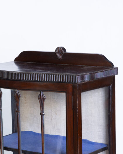 Vintage Dark Wood Display Cabinet with Blue Lined Shelves