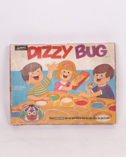 This is a vintage “Dizzy Bug” board game by Joyment Limited. The game is housed in its original box. The box has wear consistent with age, including scuffs and faded colours. The game board itself features a yellow base with coloured spots and a built-in spinner mechanism. The overall condition reflects its age, with potential minor scratches or discolouration on the plastic components. This board game provides a fun retro gaming experience and vintage visual appeal. We cannot guarantee that this game is complete.