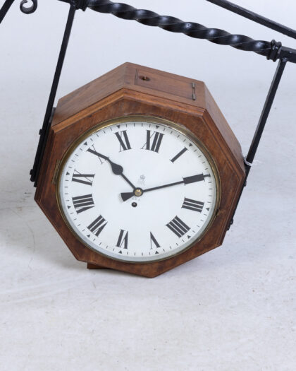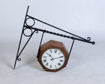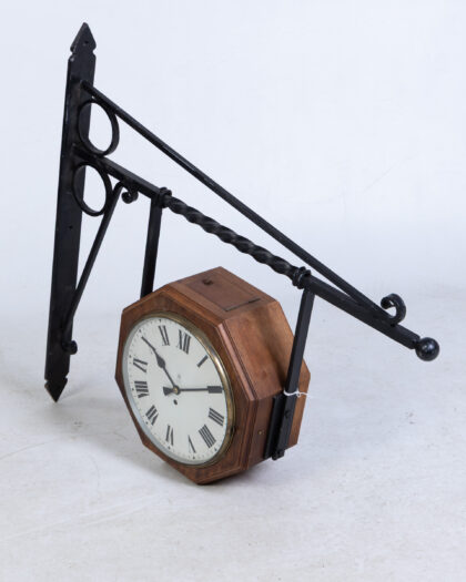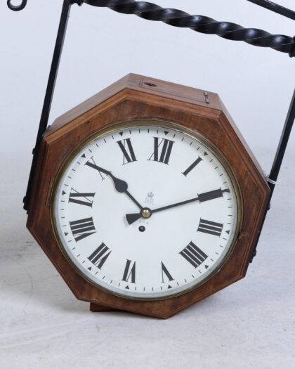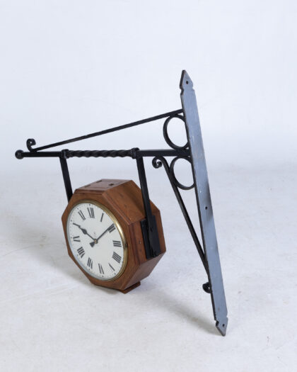 Vintage double sided GPO clock with ornate iron bracket. Octagonal wooden case and white face with Roman numerals.