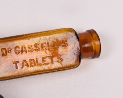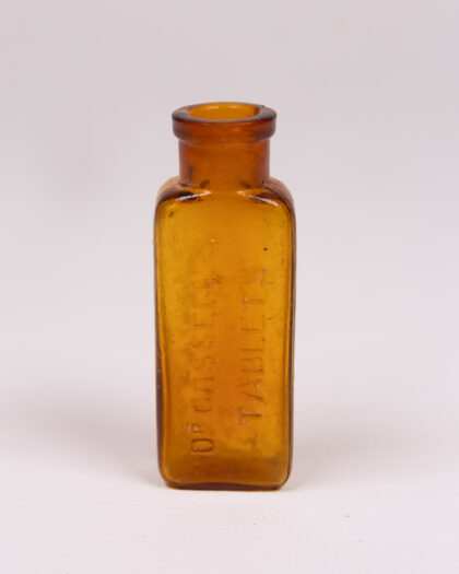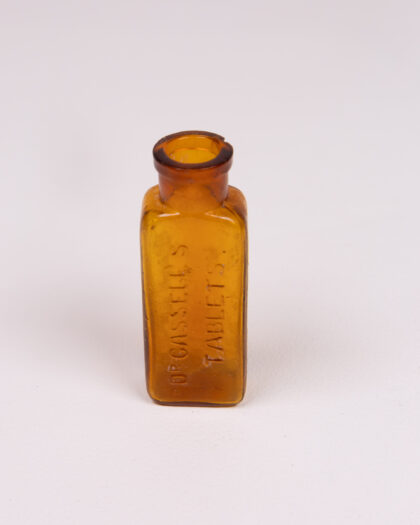 This is a vintage Dr. Cassell's Tablets glass bottle. The bottle is small and rectangular, with an amber colour. The words 'Dr. Cassell's Tablets' are embossed on the side of the bottle. The bottle has a narrow neck and a rounded lip. The bottle is in good condition, with no cracks or chips.