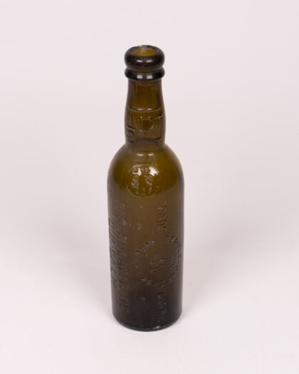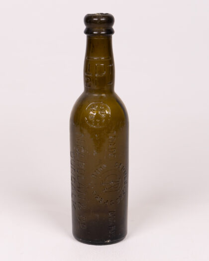 Vintage brown glass bottle with embossed text, ‘N.CAROLINA & CO’. Unique collectible for home decor. Perfect gift for the man cave, office, or display.