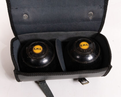 Vintage lawn bowling set with 'E.M.S.' marked composite balls and a grey carrying case, perfect for a sports enthusiast!