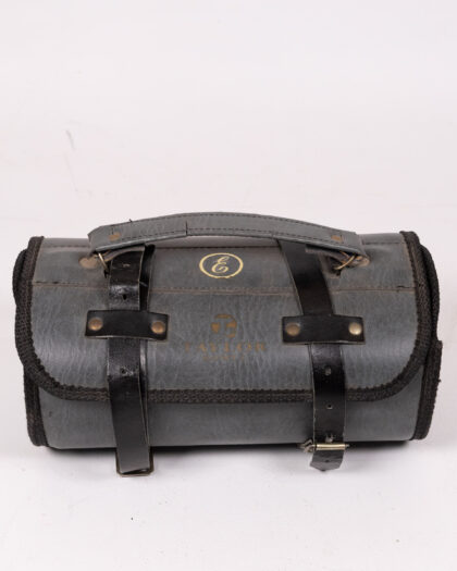 This is a set of two vintage lawn bowling balls, each marked with the initials 'E.M.S.' on a yellow emblem. The set comes with a grey carrying case that has black leather straps and a logo. The balls are in good condition considering their age, but they have some scuffs and scratches from normal use.