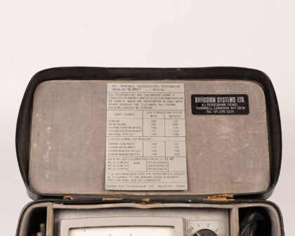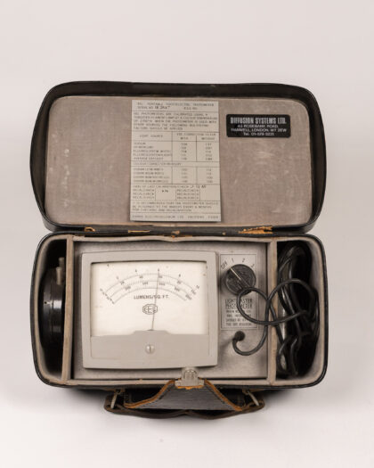 Vintage EEL (Evans Electroselenium Ltd) Lightmaster Photometer, Serial No. 18.284/7, in original black leather carry case. Untested; sold as a collectible display item. Features include a Lumens/Sq. Ft. meter, and a Lightmaster Photometer dial with settings 1, 2, 3, and Off. The case contains a calibration chart with details for different light sources. Exterior case shows wear, adding to its vintage charm. The date of last calibration check is 12.69. Diffusion Systems LTD label on inside of lid. Rare find for photography and vintage tech collectors.