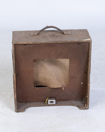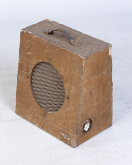 Vintage amplifier with a wood cabinet and metal grill. The cabinet shows signs of age with scratches and wear on the surface. A leather handle is attached to the top. The metal grill on the front protects the speaker. The amplifier has a simple, functional design typical of vintage electronic equipment. The back panel has connections for audio input and power.