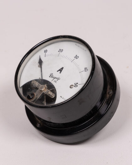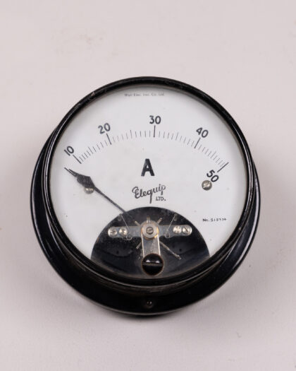 Vintage Elequip Ltd. ammeter. Black metal casing, white face, clear markings. A unique piece of scientific history. Good condition for its age.