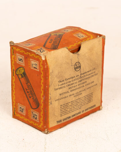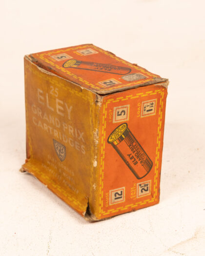 Vintage Eley Grand Prix cartridges box. The box is marked with '12 gauge' and '2 1/2 case length'. Manufactured by Eley-Kynoch Factories of Imperial Chemical Industries Limited. Slight wear and tear commensurate with age. Collectible item. Ideal display item for gun enthusiasts. Orange and yellow design. A piece of shooting history.
