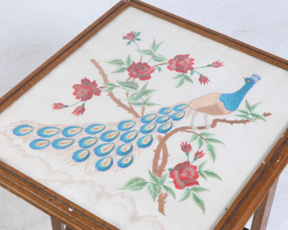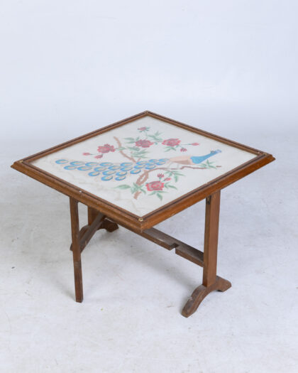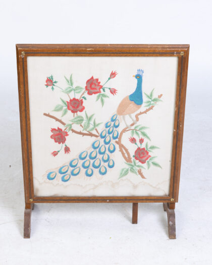 Vintage folding fire screen table with embroidered peacock design. Dual-purpose piece adds vintage charm to any living space. Some wear consistent with age.