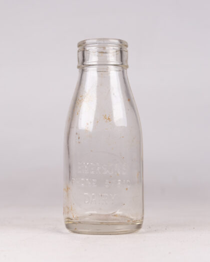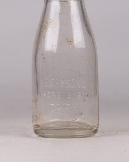 This is an original vintage Emerson's Dairy milk bottle. It is made of glass, clear in colour, and features an embossed logo with Emerson's Dairy and their phone number. It has a classic shape with a rounded body and a narrow neck, suitable as a decorative piece, part of a collection, or repurposed as a unique vase. Due to its age it presents some wear and dirt but it remains in overall good condition with no cracks.