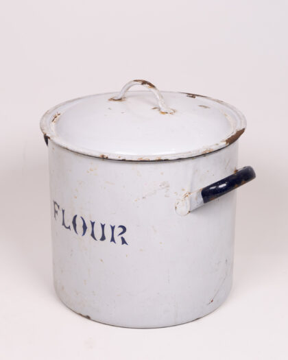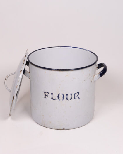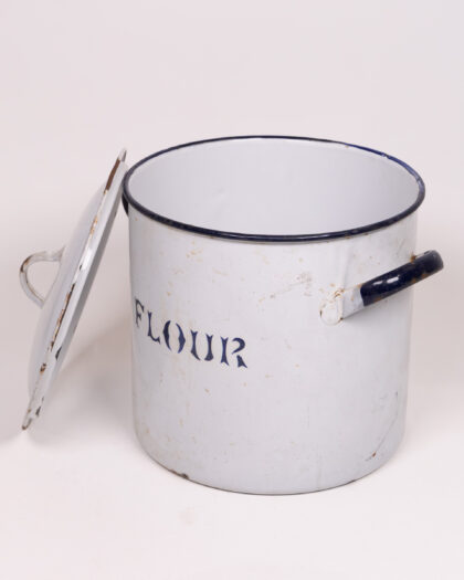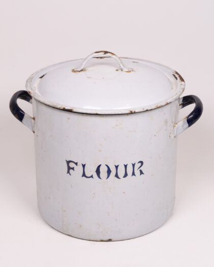 This is a vintage enamel flour canister, perfect for adding a touch of retro charm to your kitchen. The canister is made of white enamel with dark blue lettering spelling out "FLOUR". The handles are black. It comes with a tight-fitting lid to keep your flour fresh. The canister shows signs of age, including some wear and tear to the enamel, and some rust around the edges, which adds to its vintage appeal. Overall, it is in good condition considering its age.