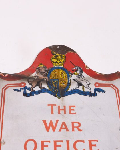 Vintage ‘The War Office’ enamel sign dating from 1925. Features the royal coat of arms. Shows wear and tear consistent with age.
