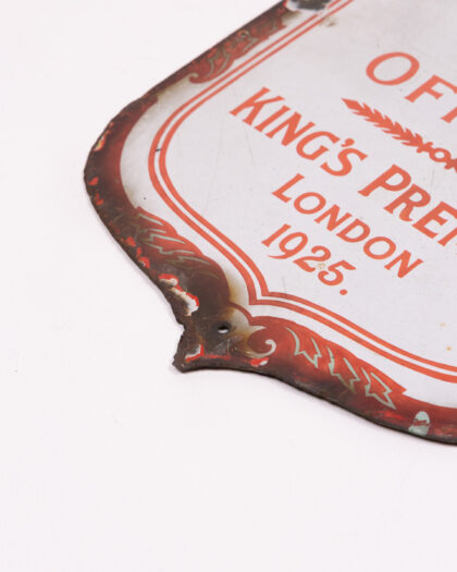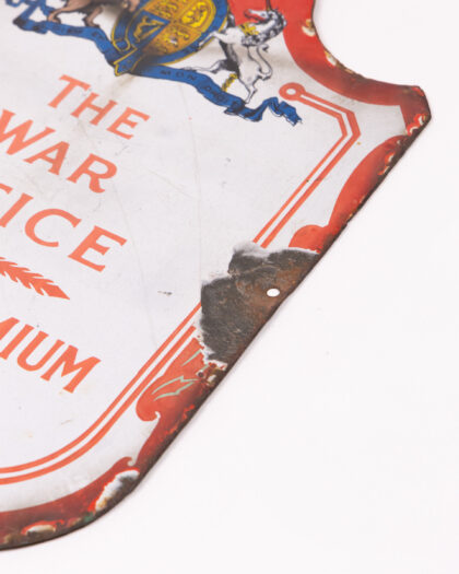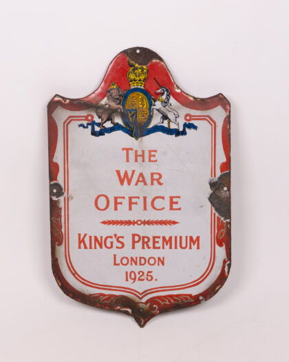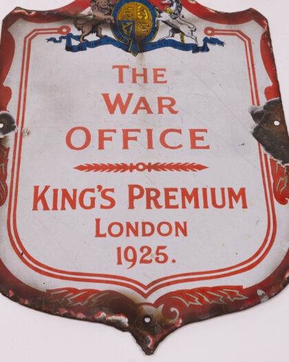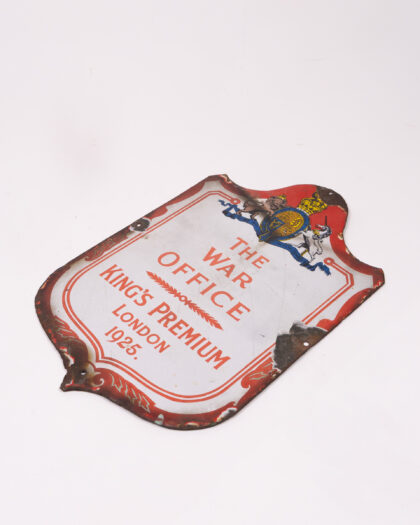 Vintage enamel sign from 1925, produced for 'The War Office' and 'King's Premium London'. Features the royal coat of arms at the top. The sign shows significant wear and tear with some enamel loss, rusting around the edges and damage to the metal. Despite the wear, the sign has a great vintage look. Would look great in a home office or man cave. A piece of historical significance 39cm x 25cm .