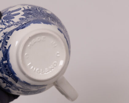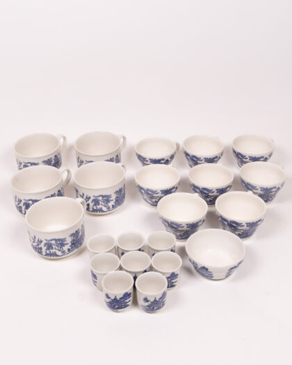 These vintage ceramic cups feature a classic blue and white willow pattern. This set includes a variety of cup sizes, including larger tea or coffee cups and smaller espresso cups. "Made in England" is imprinted on the bottom of each cup. The cups are a collectible item for those interested in vintage kitchenware or blue and white pottery. The cups are in overall good condition, with no visible chips or cracks. These charming cups are perfect for adding a touch of vintage elegance to any kitchen or dining room.